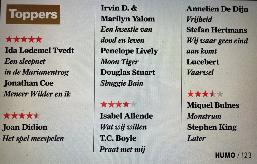 Ida Lødemel Tvedt’s Mariana Trench, Een sleepnet in de Marianentrog gets five out of five stars and ranks at the very top of the Flemish magazine HUMOs “toppers” list, above new translations of Joan Didion, Douglas Stuart, Isabel Allende and Stephen King.